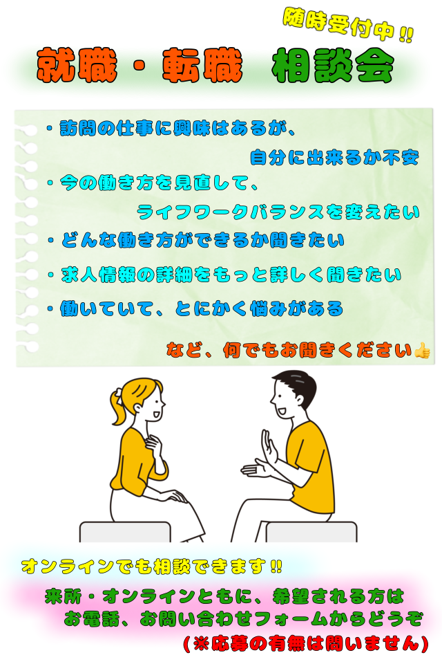 和みでは、求職者の方が安心して働けるよう、『相談会・体験会』を随時受け付けております。