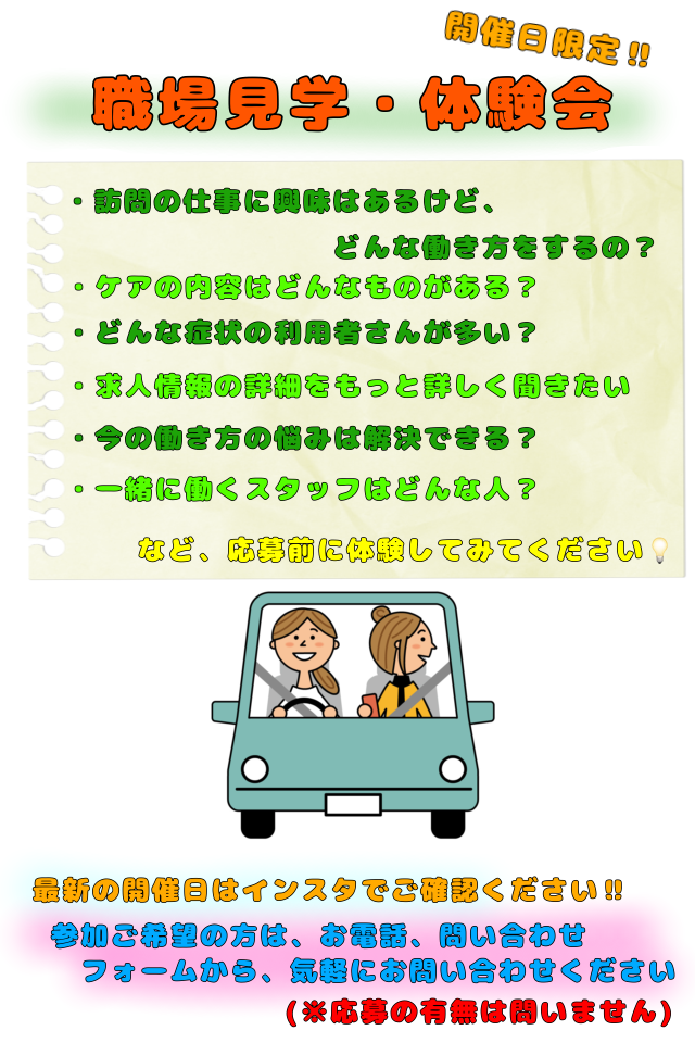 ・実際にご利用者様のお宅に同行していただき、訪問業務を見学する機会をつくっております。